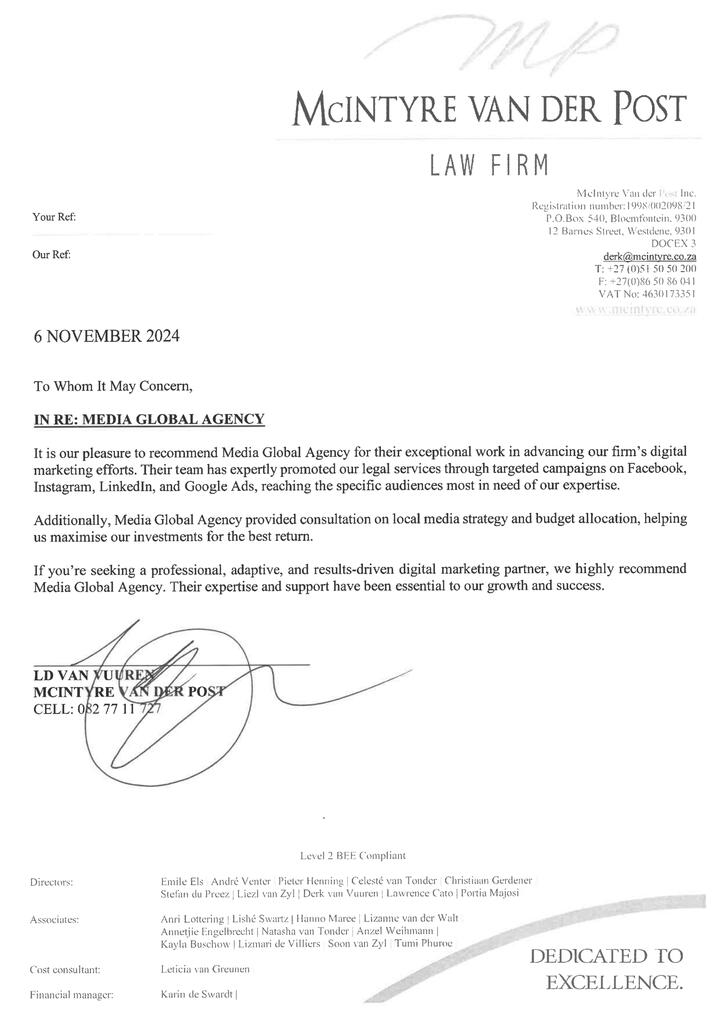 "Their team [MGA] has expertly promoted our legal services through targeted campaigns on Facebook, Instagram, Linkedin, and Google Ads, reaching specific audiences most in need of our expertise. Additionally, Media Global Agency provided consultation on local media strategy and budget allocation, helping us maximise our investments for the best return."